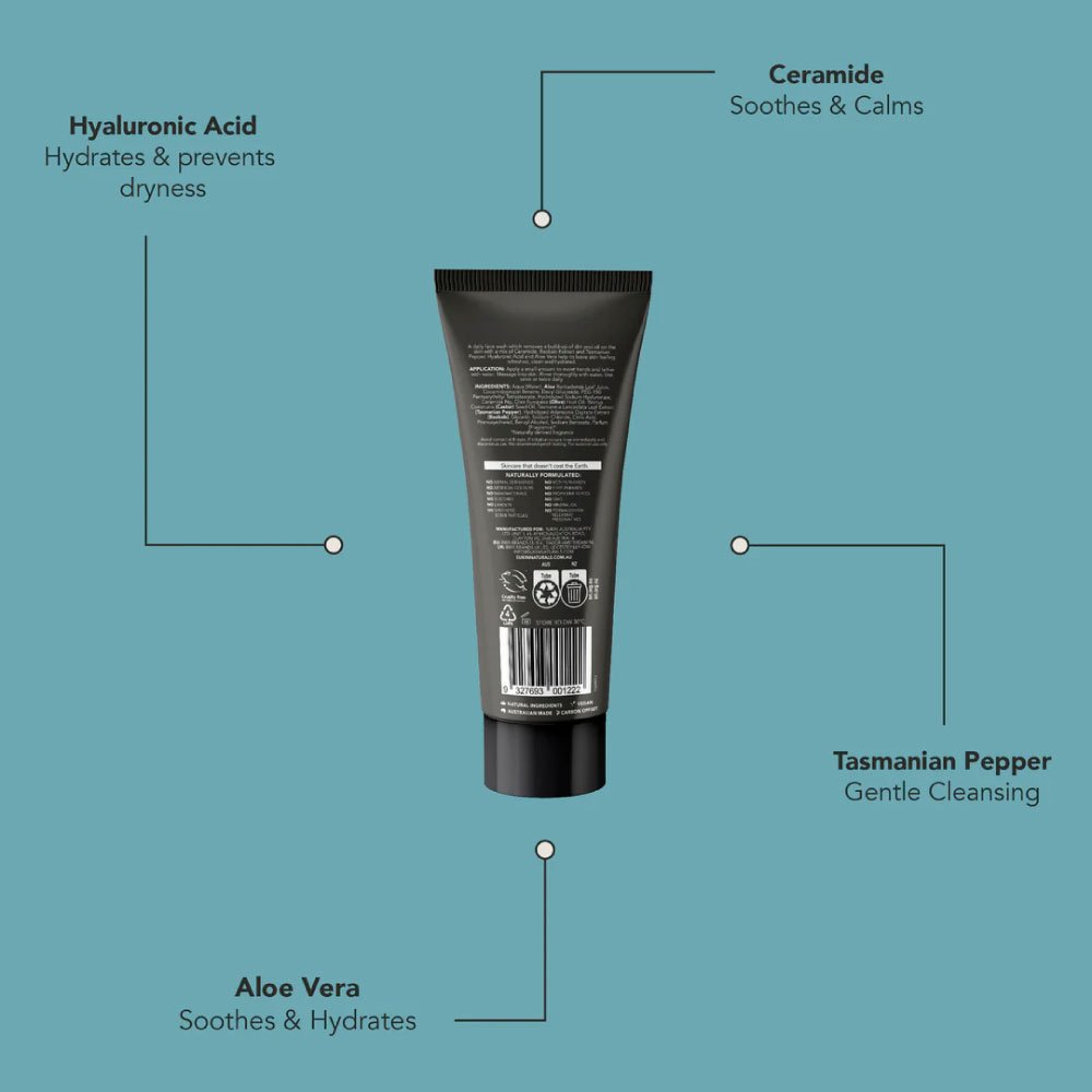 Clear dirt and oil with Ceramide, Baobab Extract, and Tasmanian Pepper. Hyaluronic Acid and Aloe Vera hydrate, leaving your skin clean, refreshed, and balanced. Powerful, easy skincare.