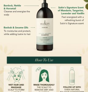 Free from sulphates, silicones and the harsh chemicals that can dry out and strip your hair and scalp, our Natural Balance Shampoo combines nourishing Burdock, Nettle and Horsetail Extracts to cleanse and energise the scalp, naturally! Added Baobab Oil helps to moisturise and protect, while adding lustre to hair. A welcomed aroma of Sukins Signature Scent of Mandarin, Tangerine, Lavender and Vanillin refresh the senses!